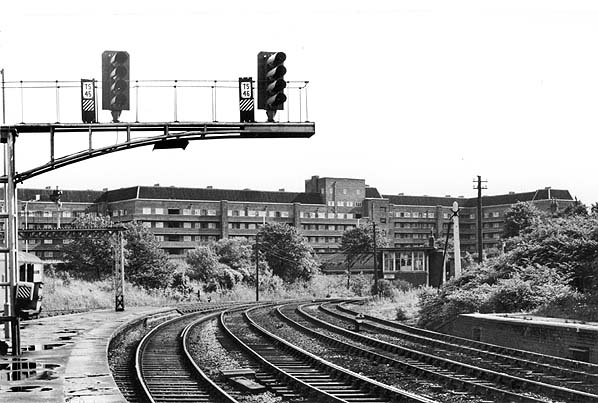 Looking south-west from the up platform c1973. The tracks curve sharply westwards here as they join the route of the Newcastle & North Shields / Newcastle & Berwick Railway which reached Tynemouth in 1847. The modern Tynemouth South signal box is seen on the right.