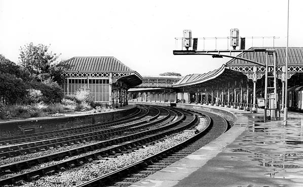 A general view of Tynemouth station, looking north c1973. This angle shows how the curve of the station enhanced the visual impact of its columns and roofing. Photo from John Mann collection
