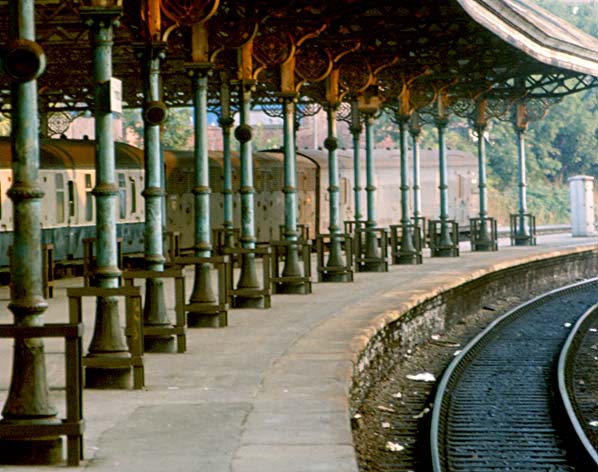 Many railway stations were works of art as well as places to board and leave trains. The colonnade effect created by the curving platform at Tynemouth is striking, and justifies the description of ‘railway cathedral’ that has been given to some of the larger stations. The faded paintwork and the guards around the bases of the columns slightly detract from the aesthetic appeal of the structure. This view southwards along the up platform shows carriages in one of the bay platforms.
