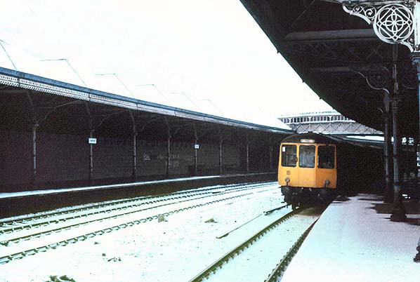 On a bitterly cold 30 December 1978 a DMU is about to depart from the down platform of Tynemouth station en route to the terminus at West Monkseaton. The geometric pattern of the spandrel under the platform roofing is clearly shown.