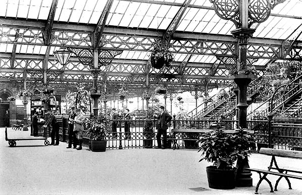 The concourse at Tynemouth station looking south c1906. This appears to be a quiet moment when station staff can stand still, one of them leaning on a luggage trolley awaiting business. Ornamental plants, for which the station was famous, almost dominate the scene, including a cascading effect on the right between the footbridge staircases. The expanse of glazed platform roofing and elaborate ironwork can also be admired. Visitors to the station were fulsome in their praise of this station.