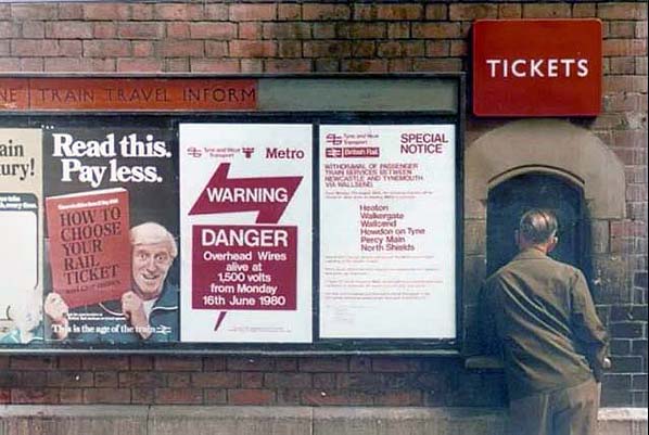 A fascinating period-piece. A customer purchases a ticket in the booking hall at Tynemouth station in 1980. The posters warn of the imminent closure of the Tynemouth - Wallsend - Newcastle route (11 August 1980) for engineering work to prepare it for Metro operation. The public are also warned that the overhead wires will be live before the advertised Metro service begins. Finally the familiar face of Jimmy Savile reminds us that This is the Age of the Train.