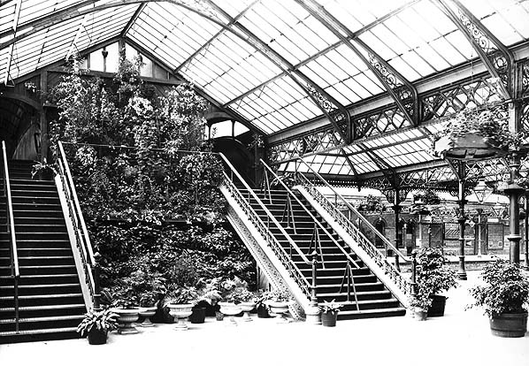 The space between the double staircase was used for a cascading effect of ornamental plants which confronted passengers as they entered the concourse from the booking hall. Hanging baskets and planters on the concourse itself add to the Kew Gardens effect in this view from c1910. The elegant ridged roof and elaborate ironwork complete this delightful scene. A visitor to the station c1900 commented that this was ‘without a doubt the prettiest station of any large town in this country with its charming beds of flowers, its pendants of floral beauty covering its roof and hanging all over its supporting pillars’. Another visitor opined that it looked more like a garden than a railway station. This photograph surely supports these accolades.