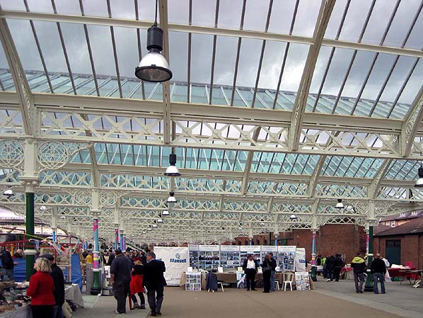 The central section of Tynemouth station, a Grade II listed building, has now been fully restored. By filling in part of the two bays, the concourse has been opened up as a major events space and is used for markets, arts events, theatre and exhibitions. This view looking north in June 2012 shows the infilled south bay; the two platform edges are still clearly visible.