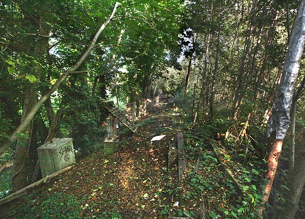 The west end of the east bound platform at Uckfield Station in October 2007. The west end of the platform was iof timber construction supported on the concrete pillars. Part of the timber ramp can be seen in the centre foreground.
