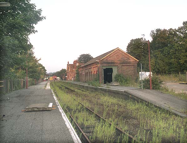 Uckfield Station and goods shed looking north in July 1991. A train can be seen standing at the resited station on the other side of the level crossing. Photo by Nick Catford