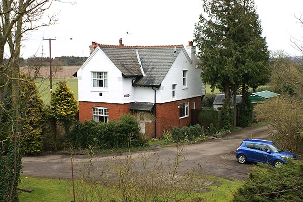 The Upton Magna station house seen looking north-east on 8 March 2016. The house was a later addition to the station. Behind the blue car and to the left of it can be seen stone sett paving. This marks the point where the entrance to the station building had been.