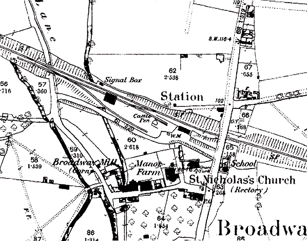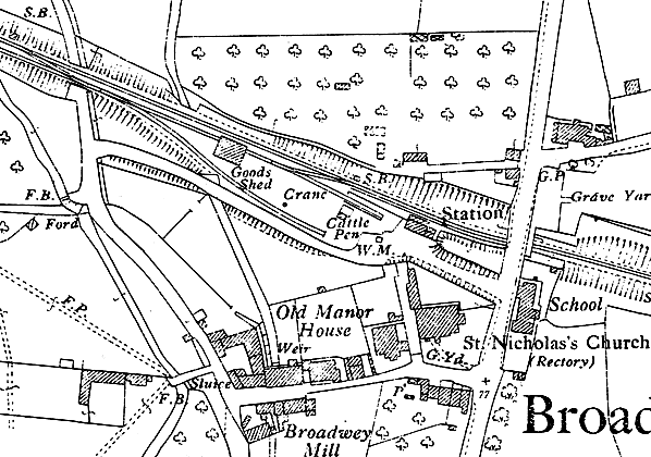 Notes: The station opened with the line and was originally named Broadway. It was sited on the west side of the main Dorchester - Weymouth Road, close to the village centre and only 600yd from Upwey Junction station on the main line. On 24 June 1896 the spelling was changed to Broadwey after official advice had been taken. This spelling had been used in GWR timetables since 1893. The origin of the name is from the River Wey, as in Upwey and Weymouth, but the standard spelling seems - illogically - to have been Broadway well into the twentieth century. Ekwall's Oxford dictionary of English place-names (1960 edition of original 1935 publication) refers to 'Broadway' whilst associating the name with the River Wey. Although shown as Broadway on early Ordnance Survey maps, the post-war Popular' one-inch map spells the village 'Broadwey', as do current maps