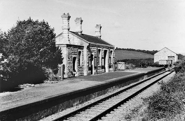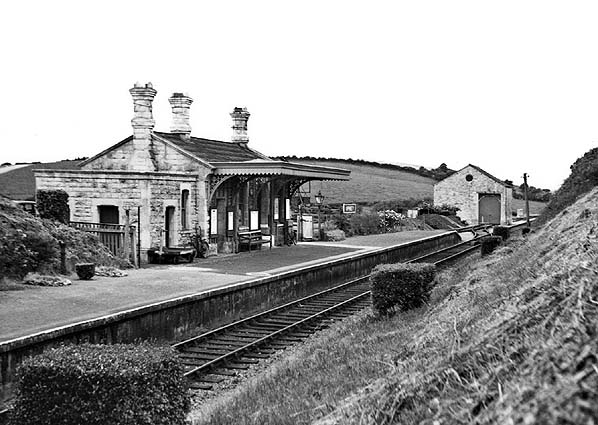 The station had a single platform on the down side of the line. A single-storey warm yellowish limestone building with a hipped slate roof and three tall chimneys stood in the centre of the platform. It was similar to the buildings at Abbotsbury and Portesham and was constructed by sub-contractor Edwin Snook of Upwey to a design by William Clark, a freelance railway |