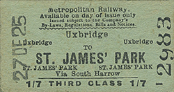 Photo from Jim Lake collection ![]() The ceremonial first train of 30 June 1904 is seen here at Ruislip, this photograph being included because of the event rather than the location. Both the Metropolitan and Metropolitan District Railways were fond of large destination boards and indeed the former's early batch of electric locomotives, the 'Camel Backs', carried enormous roller blinds extending the full width of the locomotives. This would have been a good idea in the dimly lit, compared to today, smoky stations of the time assuming waiting passengers could read - inability to read and write was still very common at the time. If a photograph from this same spot were taken today, the photographer would be standing beneath the station footbridge but at opening the footbridge was further west, behind the camera.