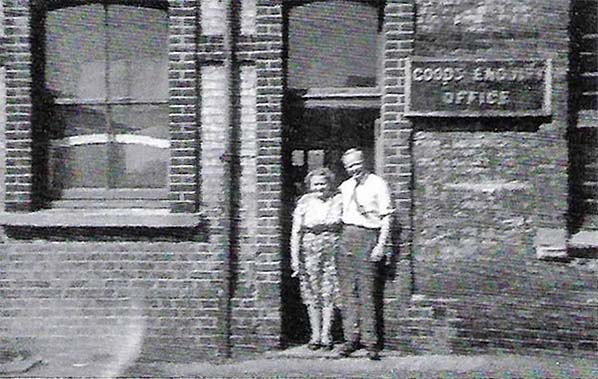 Photo by David Pearson ![]() Goods clerks Winnie Ward and Brian Hicks at the door of the goods inward office after it has been relolcated from the goods shed to the station c1960.