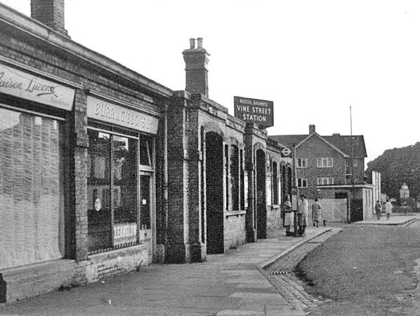 Photo received from Matt French ![]() Vine Street station forecourt in July 1962, eight weeks before closure to passengers. Two shops are seen on the left, Burr and Gibbons is a coal merchant and Maison Lucena iks a ladies' hairdressor. The housing beyond the station is still standing.