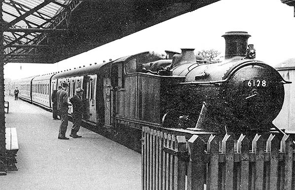 ![]() Collett 6100 Class 2-6-2T, one of the so-called 'Large Prairies', No.6128 stands at the bufferstop at Uxbridge Vine Street when the locomotive was allocated to Slough. The 6100 Class was the mainstay of suburban services out of Paddington until ousted by DMUs and No.6128 had most likely arrived at Uxbridge from Paddington. Class members employed on these services were fitted with tripcocks (the apparatus was mounted between the second and third driving axles) for working over London Transport tracks at Paddington - a movement no longer possible today. The nearest carriage is attracting some attention as the locomotive crew look on. The carriage is a BR Mk1 suburban, introduced in 1954 so this will be the earliest possible year for the photograph while the latest date would be August 1960 when No.6128 was sent to Kidderminster. She returned to the London area, this time at Southall shed, for a brief period late 1964 - early 1965 but this of course was too late for her to put in an appearance at Vine Street. There is another locomotive in this photograph, sharp eyed readers may have spotted. An 0-6-0 Pannier Tank is at the rear of the train, ready to draw the stock out of the platform in order to release No.6128 as no run-round facilities were provided. The exact procedure is not known and would probably have depended upon the time of day; No.6128 may have coupled to the other end of the train and returned along the branch in service or the Pannier may have shunted the stock into a siding for stabling with the two locomotives leaving the branch on goods or parcels trains or light engine.