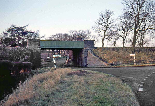 ![]() Station Name: VELVET HALL![]() This railway bridge at crosses the road towards Horncliffe (ahead) south-west of Velvet Hall station. The chimneys of Station Cottages can be seen immediately beyond the bridge. The photo is c1963.