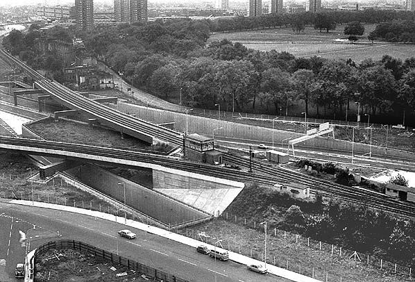 remained derelict. Everything was cleared away in 1970 during the construction of the A102M motorway (Now the A12) which cut through the southern end of the Poplar line platforms at a lower level. This involved the removal of the embankment on both lines with new concrete viaducts spanning the new road and its slip roads. The new carriageways passed either side of the station leaving a small isolated section of embankment with the signalbox.