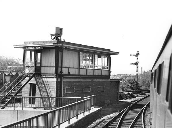 ![]() Victoria Park signalbox in seen from a passing Stratford train in May 1979. The platform started immediately in front of the signalbox where the southbound carriageway of the A12 now tunnels under the railway. Photo by Graham Larkbey |