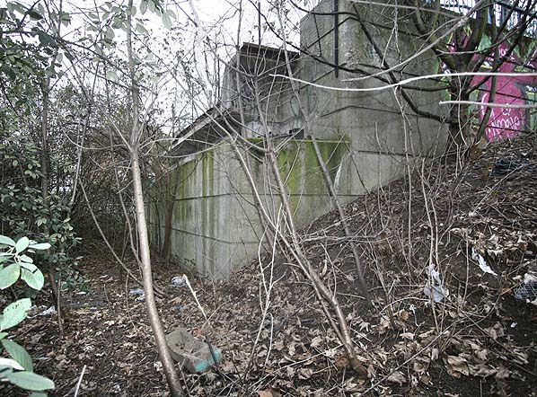 ![]() Northern abutment for the viaduct taking the North London line over the A102M (Now A12) in March 2009. This stands on the site of the Poplar line platforms. Photo by Nick Catford |