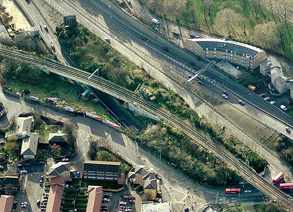 ![]() Aerial view showing the site of Victoria Park Station. The remains of the signalbox can be seen in the centre of the picture with the Stratford line to the left. The abutment for the viaduct over the A102M can be seen immediately above the signalbox. Most of the platform site was obliterated when the road was built, the Poplar line platforms started immediately above the signalbox. |