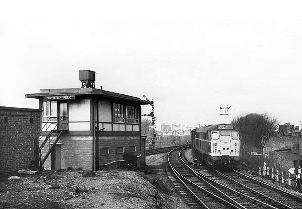 Victoria Park Station looking north west in 1968, the degraded remains of the Stratford platform are seen in the foreground.