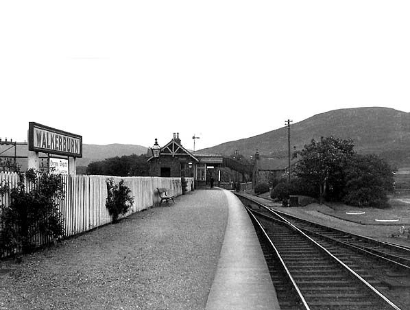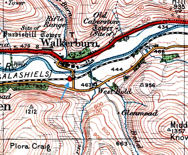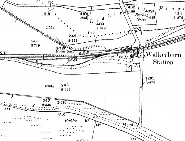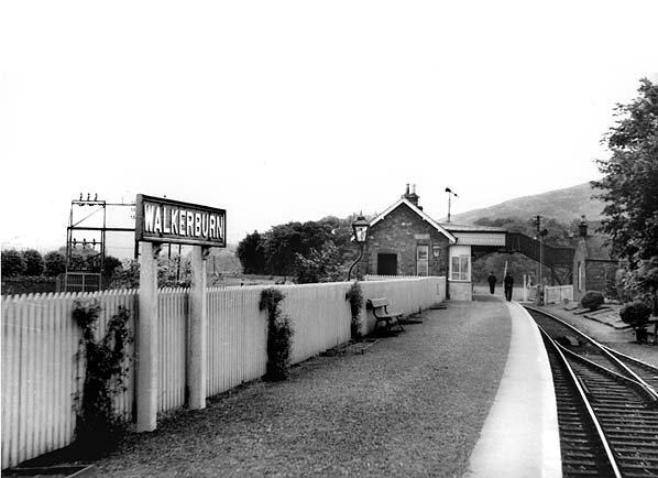 Notes: Walkerburn station was not ready when passenger trains were introduced on the second section of the extension from Peebles to Galashiels on 18 June 1866; it opened six months later on 15 January 1867. The Peebles Railway took advantage of the low-lying land on the north bank of the River Tweed, with the station sited to the south of the wool-manufacturing village.