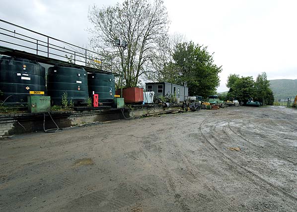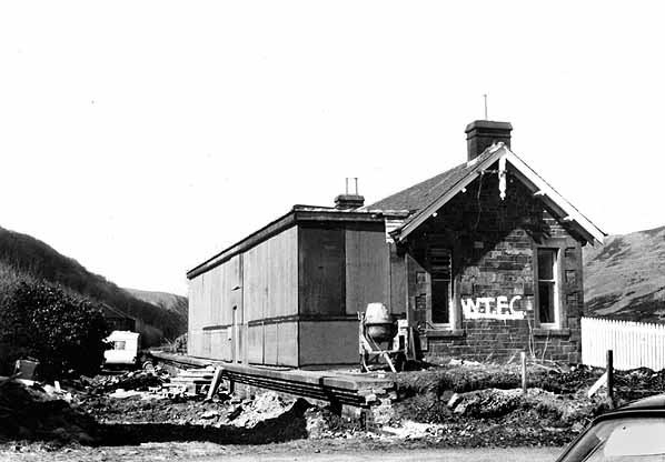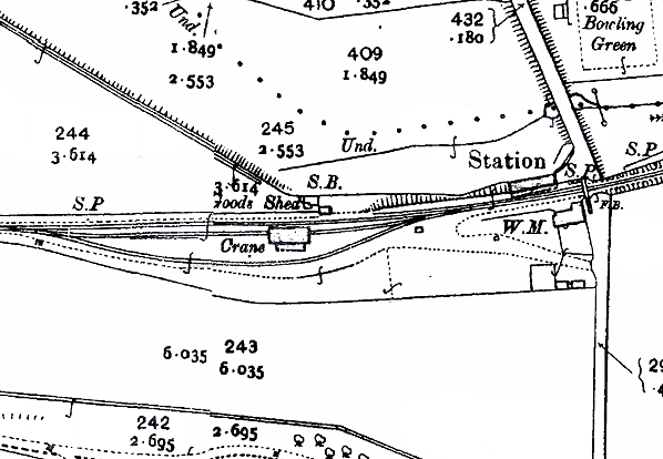 The original signal box was replaced in 1895 with the new box standing beyond the platform on the up side; the box controlled the crossing and the goods yard, which was on the down side. The yard comprised two sidings, each of them loops giving access to the yard from both directions. The siding nearer the main line passed through a stone goods shed with a canopy on one side to protect road vehicles while unloading. There was a 2-ton crane in the yard.
