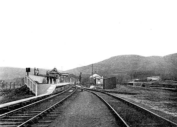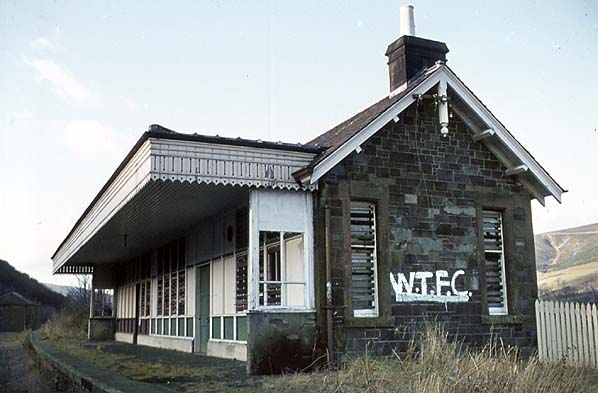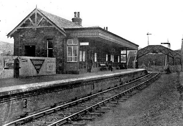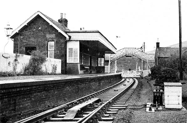 The single platform was on the up side, west of the level crossing. The rectangular station building was single-storey and stone-built with a pitched roof and a canopy stretching almost to the platform edge. The building contained a booking office, waiting rooms and toilets. A wooden footbridge was provided at the level crossing to allow pedestrians to reach the platform |