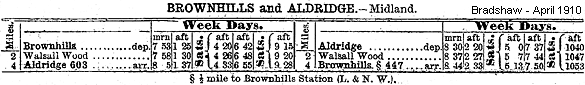 The passenger service ran as a shuttle between Aldridge and Brownhills, and by December 1895 there were three trains in each direction on Monday-to-Friday, as shown in the table below. On Saturdays there were two extra trains in each direction, but no trains ran on Sundays.