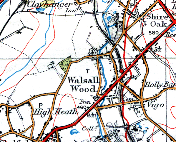Notes: Walsall Wood station was situated on the 5½-mile Brownhills branch that connected to the Walsall and Castle Bromwich line at Aldridge. The Midland Railway (MR) obtained two Acts to build the line. The first, granted in 1876, authorised a line from Aldridge to Walsall Wood, and the second, granted in 1880, was for an extension from Walsall Wood to Cannock. The primary purpose of the line was to give the MR access to the collieries in the Brownhills area, and it opened to goods services in April 1882.