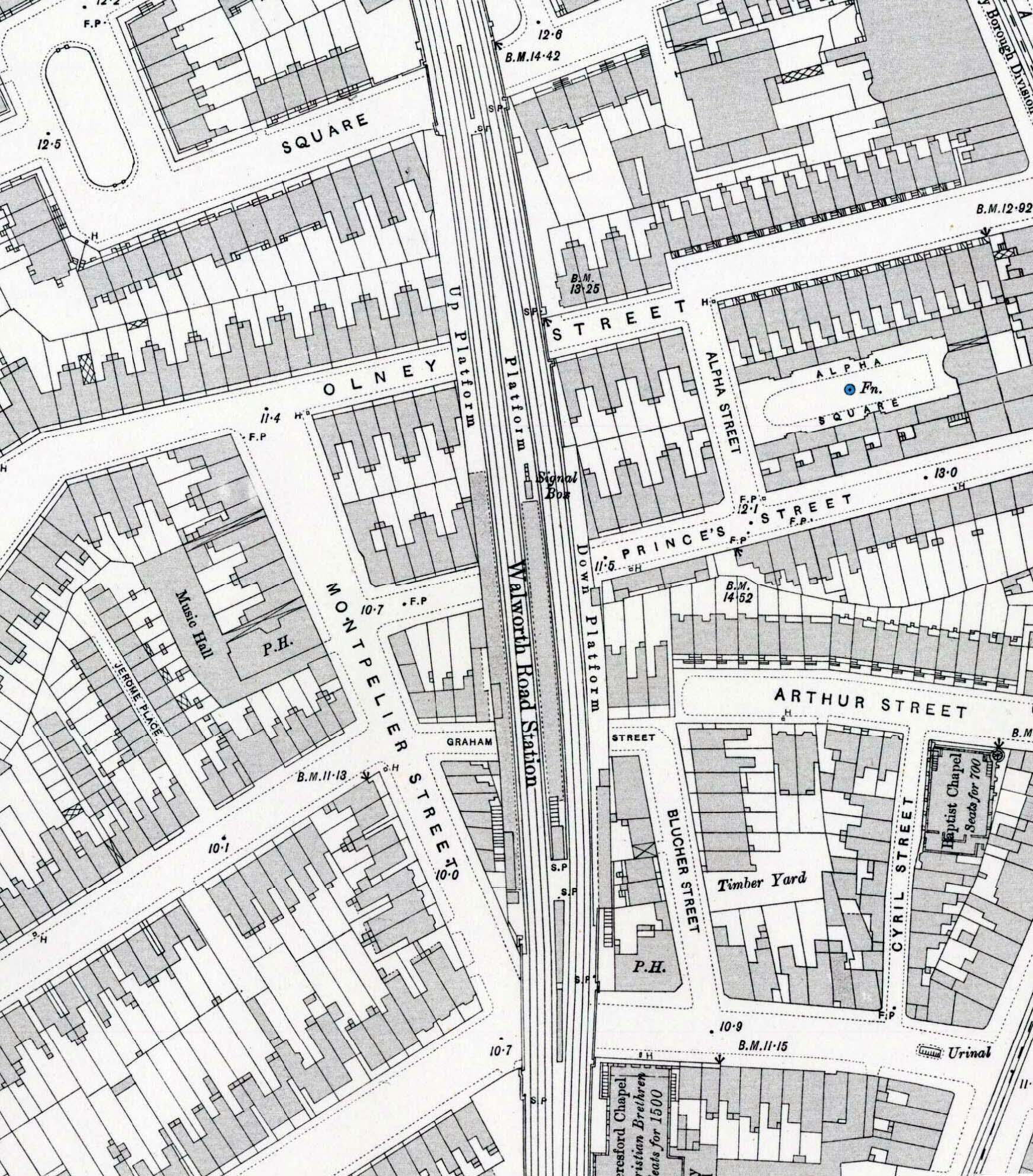 1898 1:1,056 OS Town Plan. This shows the station spanning three roads. The entrance is in Beresford Street at the bottom; it then passes over Graham Street, Princes Street and Olney Street, stopping short of Sutherland Square to the north. The local lines are to the west with the main lines to the east. The down main line platform is noticeably shorter then the other platforms, stopping between Princes Street and Olney Street. The shaded area indicates the position of the canopies, that on the down main line platform being shorter than the others. There are external stairs on the side of the viaduct serving the outer platforms. The signal box is seen at the north end of the island canopy. Click here for a larger version of this map.
