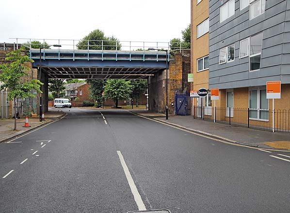 ![]() Station Name: WALWORTH ROADLooking west along John Ruskin Street (formerly Beresford Street) from a similar viewpoint to the 1912 picture. The station entrance is where the blue gates are seen between the bridge and the flats. The flats are built on the site of the Station Tavern which closed in 1992.