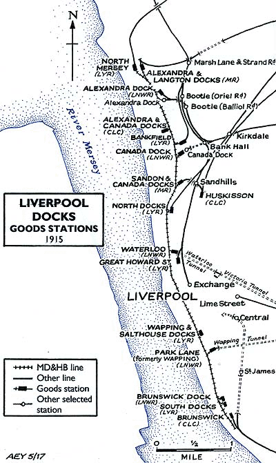 On 1 January 1922 the LYR was taken over by the LNWR and a year later, on 1 January 1923, the LNWR was taken over by the London, Midland & Scottish Railway (LMS). One company now found itself in the possession of a number of goods stations within the Liverpool dock system. The LMS concentrated specific goods at some of its stations to avoid duplication of facilities.