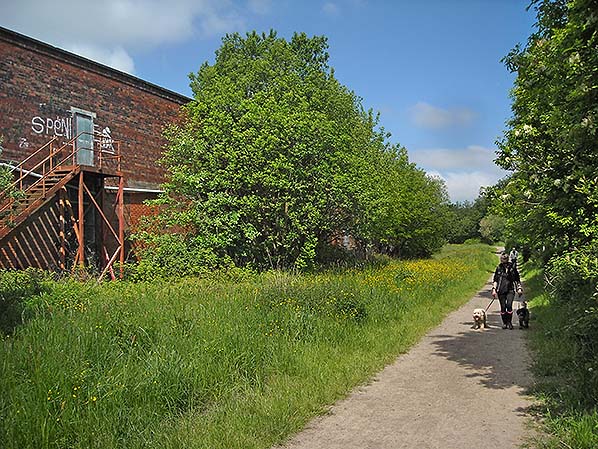 ![]() Looking north from a few yards north of Fieldhouse Road along the trackbed of the former Facit Branch on 2 June 2016. The wall of the old Fieldhouse Mills is seen to the left; behind the trees it curves left following the alignment of the railway. The mills were rail-served until the 1950s. On this warm, sunny day the route is providing a welcome ‘green corridor’ through the northern suburbs of Rochdale for quiet strolls, with or without dogs for company. Photo by Alan Young