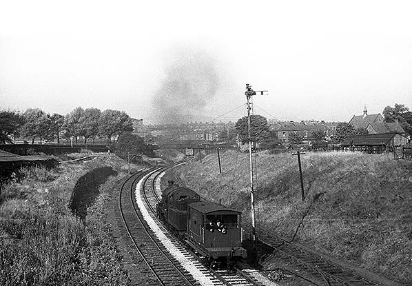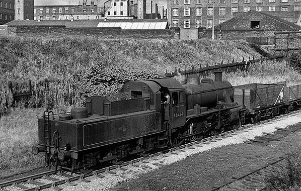 ![]() Looking north from above Whitworth Road Tunnel, the LCGB ‘Middleton Branch Brakevan Tour’ is seen on its return journey from Whitworth to Rochdale on 7 August 1965. The train originally consisted of nine brake vans but on its ‘down’ journey it stalled on the 1 in 59/62 gradient north of Wardleworth, and the loco propelled its load back to Wardleworth where five of the vans were detached. The four remaining vans completed the journey to Whitworth and back to Wardleworth, where the train was re-formed to the full nine vans. The loco, No.42343, a Fowler Class 4P-D 2-6-4T was built at the LMS Derby works in April 1929 and allocated the number 2343. About two months after her journey to Whitworth she was withdrawn from 13A, Trafford Park shed, and cut up by Cashmores, Great Bridge, in November 1965. The large building on the left is Minky’s kitchenware factory on Bentley Street.