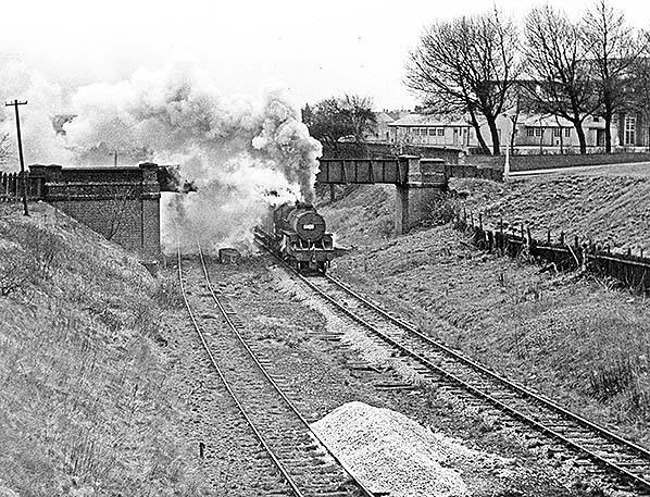 ![]() Looking south-west from Greenbank Road (a short distance north of Wardleworth station) on 15 October 1960 as a freight train stands on the ‘down’ line of the Facit Branch. The ‘up’ line, closer to the camera, is reverting to nature. A wagon is seen on the siding beyond the train, and a loading gauge is still in place over the siding. No.46414, an Ivatt-designed Class 2F-B 2-6-0 loco, was built at the LMS Crewe works in February 1947 and was withdrawn from 13D, Northwich shed, on 30 June 1966 to be cut up by Birds, Long Marston, Warwickshire in December 1966. Greenbank schools are seen