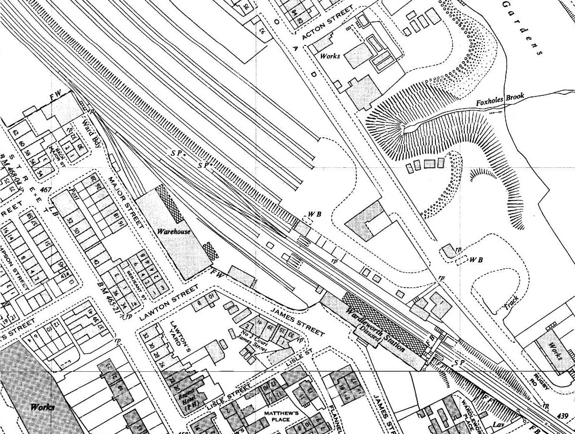 958-59 1: 2,500 OS map. Wardleworth station is labelled ‘disused’ even though the goods facilities are still active. The platforms and buildings are in situ. Wardleworth Siding[s] has been removed, but the other sidings and goods warehouse are shown.