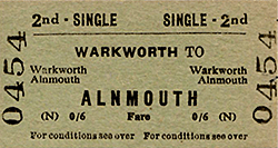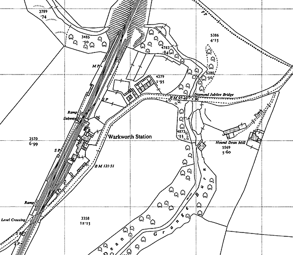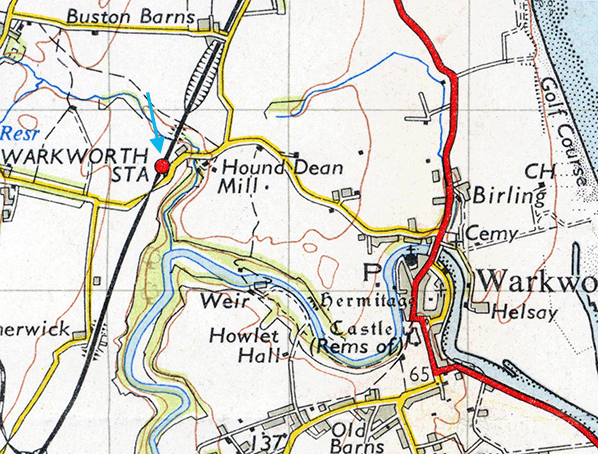 Copyright photo from John Alsop collection ![]() ![]() 1864-1895 1: 2,500 OS map. Warkworth station is seen in its rural seclusion, with only Hound Dean Mill conveniently served; Warkworth village is about 1¼ miles further east, along the lane. Almost all of the station’s structures are on the up (east) platform, with only a waiting shed on the facing down platform. By the end of the nineteenth century the down platform would be relocated to the north of its original position. On the up side north of the station a siding, with a headshunt, enters the goods shed (not identified by name). The coal depot is south of the station building. The cattle dock adjoins the level crossing on the down side, and it is reached by two sidings, and a headshunt approaches the ramp of the down platform.