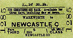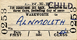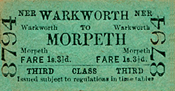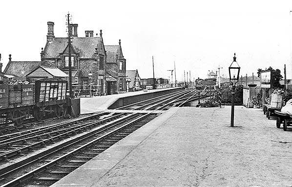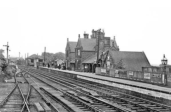 ![]() Warkworth station looking south from the down platform c1910. The oil lantern and running-in nameboard, both of NER design, are in the foreground. The main passenger facilities are on the up platform, reached from the down platform by a subway and barrow crossing. The dignified main building displays all the hallmarks of Benjamin Green’s designs for the N&B stations which opened in 1847: the Gothic ‘Jacobethan’ sandstone structure boasts bay windows, raised gables, ball finials and tall chimneystacks. The siding directly ahead serves the cattle dock and occupies the original position of the down platform. Beyond, in the distance, the hipped roof of the signal box can be seen. This was the second signal box at the level crossing, having replaced one on the opposite side of the tracks.