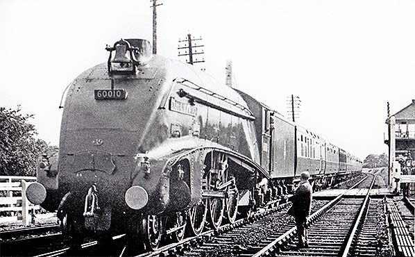 Copyright photo from John Alsop and Alan Young collection ![]() In this 1950s or early 1960s view facing south, A4 Pacific ‘Dominion of Canada’ is standing on the up line at Warkworth level crossing. The station is behind the photographer. The Gresley-designed 4-6-2 loco was built by the LNER at its Doncaster works in May 1937. Initially carrying the number 4489, and later 10, under BR in October 1948 the loco was renumbered 60010. The loco was withdrawn from 61B, Aberdeen Ferryhill shed, on 29 May 1965, and was shipped to Canada to be preserved in the Canadian Railway Museum, Quebec. In 2012 she returned to the UK to be displayed at Shildon and at the National Railway Museum, York, but is now in Canada once more.