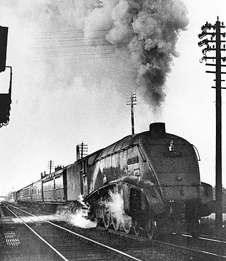 In this 1950s view facing north, A4 Pacific ‘Guillemot’ is passing Warkworth Crossing. The roofline and chimneystacks of the station building are seen beyond the coaches. This Gresley-designed 4-6-2 loco was built in January 1938 by the LNER at the company’s Doncaster works and initially numbered 4465 and later, 20. Under BR the loco was renumbered 60020, as seen in this picture. On 20 March 1964 the loco was withdrawn from 52A, Gateshead shed, to be cut up at BR(NE) Darlington works, North Road, in February 1965 Click here for Warkworth Station Station Gallery 2: September 1972 - July 2014