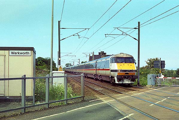 Photo by Alan Young ![]() On 24 June 1996 No.82217, propelled by 91117, is passing the site of Warkworth station on the 14.00 Glasgow Central to London Kings Cross. The relay room in the foreground, carrying a Corporate Identity nameplate, is on the opposite side of the level crossing from the signal box which, demoted to a gate box, closed in 1967.