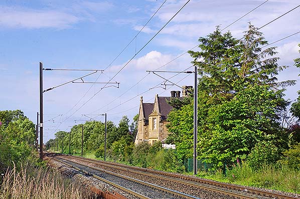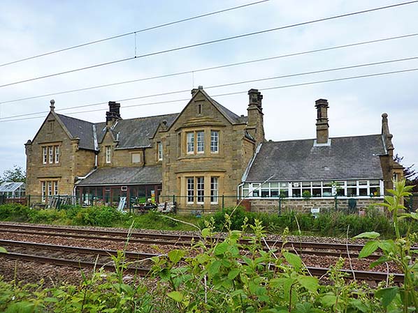 Photo by J J Thomas, reproduced from Geograph under creative commons licence ![]() The station building at Warkworth, looking north-east across the tracks of the electrified East Coast main line in July 2014. Nothing remains of the platforms.