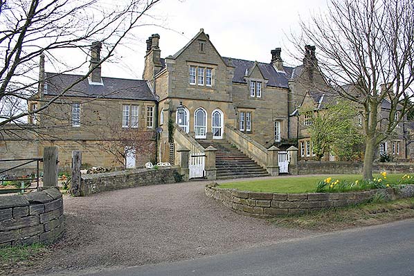 Photo by Alan Young ![]() Warkworth station’s road frontage is seen here in April 2005, looking north-west. This view across the forecourt conveys the generous size and dignity of the station building; its position, well set back from the road, allows the design to be appreciated fully. The principal element is the two-storey station house and offices, gaining prominence as it is raised on a basement so that the lower storey corresponds to the level of the former platform. The single-storey wing on the left, again standing above a basement, is understood to have housed the private waiting room of the Duke of Northumberland. The two-storey building, on the right, at road level was the porter’s accommodation. The buildings are all in residential use. The pale sandstone is now restored to its original colour; the pictures taken in 1972 and earlier show it in its soot-blackened state.