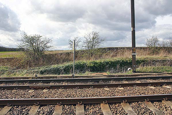 Photo by Alexander Kapp, reproduced from Geograph under creative commons licence ![]() Looking north from the level crossing in April 2013, the station building at Warkworth can be seen – with difficulty – behind a tree to the right of the railway tracks. The overgrown ramp of the cattle dock is visible to the left of the rails, beside the warning sign.
