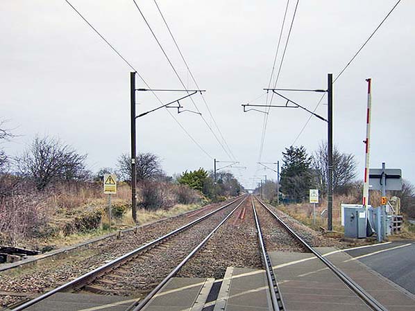 Photo by Steven Hedley from his Flickr photostream ![]() The ramp of the old cattle dock at Warkworth is seen in April 2005, looking west at the level crossing.