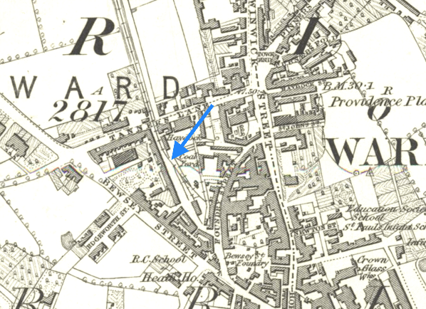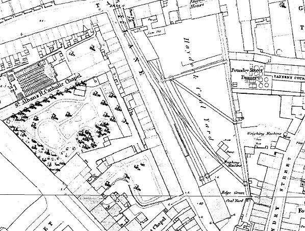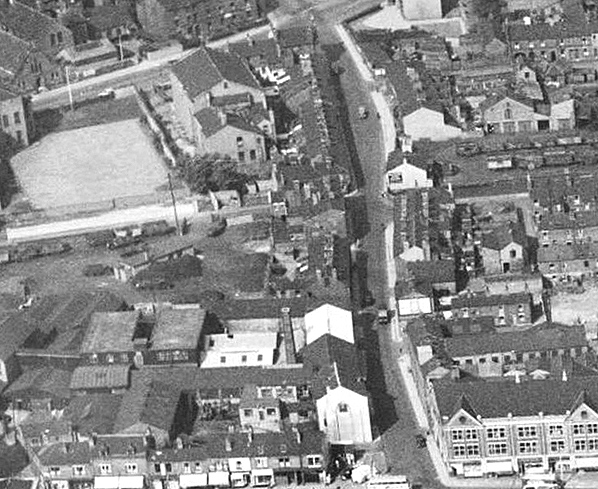 ![]() Warrington Dallam Lane station seen from the air in 1953 when it was still in use as a rail served coal yard. The station yard is middle left and railway wagons can be seen stabbled there. The station building which became a pub is to the right of the yard on Tanners Lane which can be seen running top to bottom. The line passed to the side of the building crossed Tanners Lane ran to the side of the white building and then ran north to Earlestown. More yards and sidings developed on the north side of Tanners Lane after closure to passenger services the bottom end of which can be seen middle right.