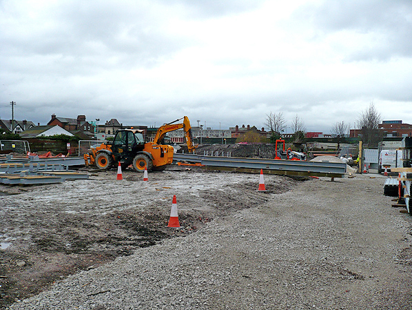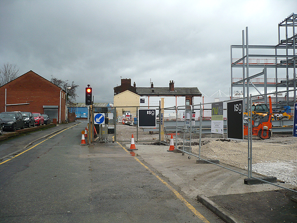 Photo by Paul Wright ![]() Looking east along Tanners Lane towards Warrington Dallam Lane station on 18 December 2014. The line crossed Tanners Lane and ran where the police van and cars can be seen. It then curved into a yard thyat was at the rear of the station building. Photo by Paul Wright ![]() A view looking north along Dallam Lane on 18 December 2014. Warrington Dallam Lane station had been to the right on the land that was being developed when this view was taken. The station building can be seen in the distance.
