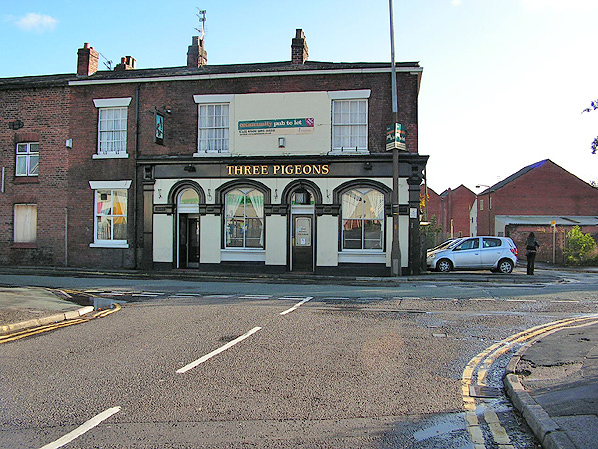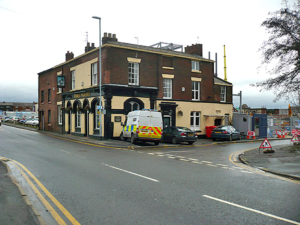 Reproduced with the kind permission of Simmons Aerofilms Ltd ![]() ![]() ![]() ![]() Looking south towards Warrington Dallam Lane station on 26 October 2008. The 'Three Pigeons' pub was the original station building that had been built in 1831. The ground floor had been altered in the late 19th century. The line passed to the right of the pub where the cars can be seen. At the rear of the station building there was a yard area and it is likely that trains departed from there.