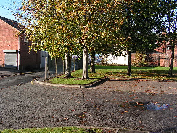Photo by Paul Wright ![]() A view looking north at the site of Warrington Dallam Lane station on 26 October 2008. The station building, which became the 'Three Pigeons' pub can be seen beyond the trees.