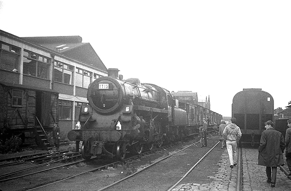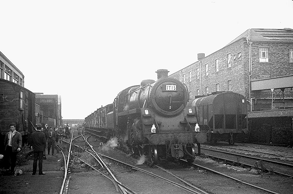 ![]() Looking south towards the site of the Warrington Dallam Lane passenger station from the goods facilities that had developed to the north in the period after the stations closure. The station site is out of view at the far end of the line that can be seen curving left beyond the locomotive. The photo was taken during a visit by the LCGB 'Warrington and Widnes Brake Van Railtour' on 5 August 1967.