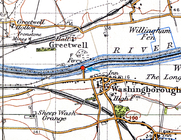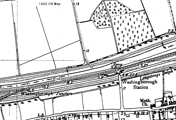 Notes: Washingborough station served the village of that name and the village of of Greetwell on the north bank of the River Witham, with passengers using the Washingborough chain ferry to reach the station. The station had two platforms with the main station building on the down side of the line; the building incorporated the stationmaster's house and booking office at right angles to the line with a flat roofed waiting shelter on the platform with no buildings on the up platform.